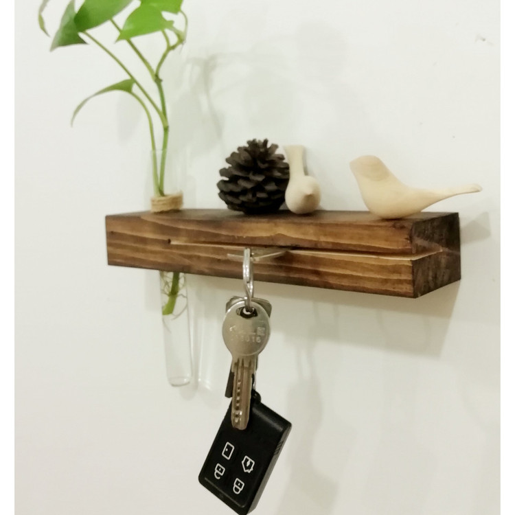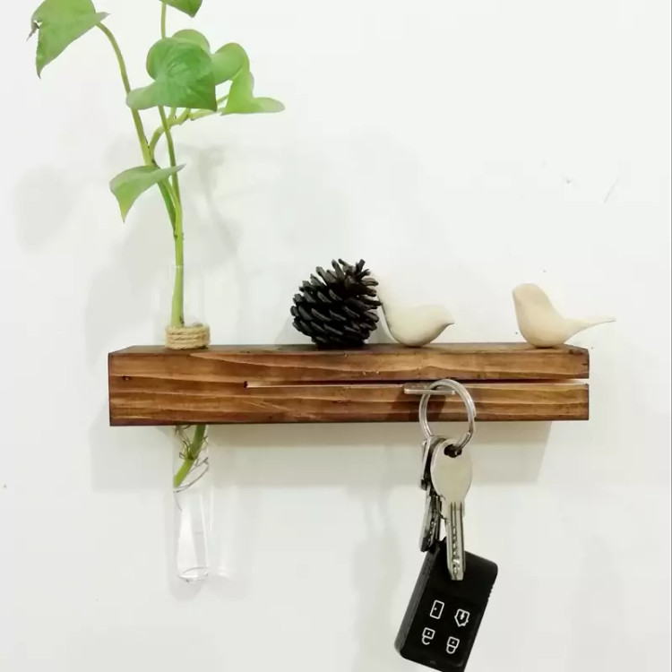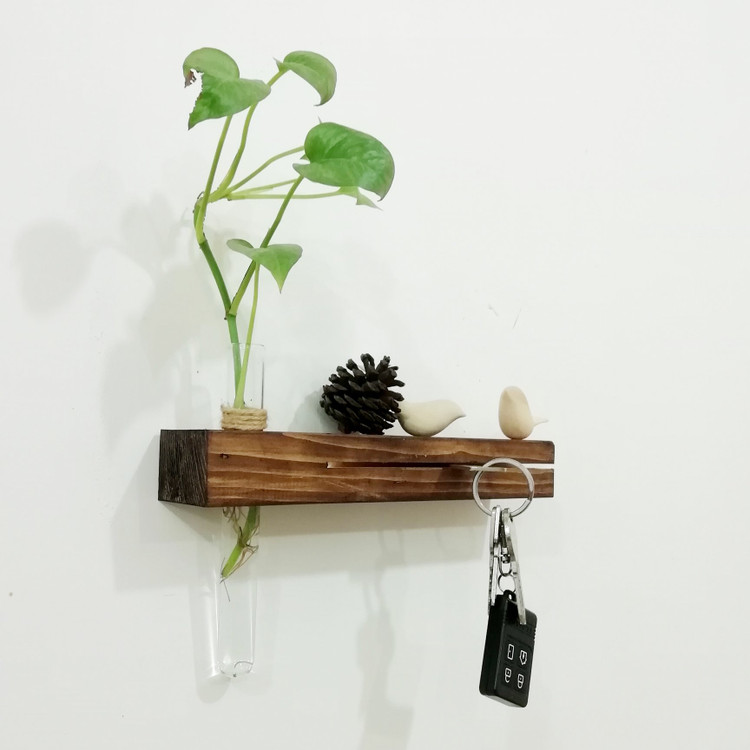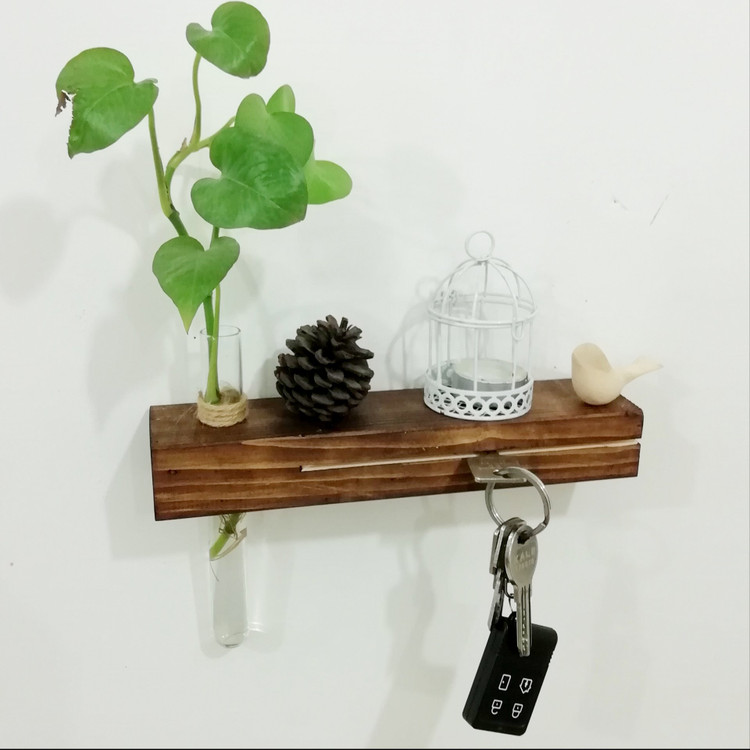 شلف دکوری چوبی همراه با کاربری به عنوان جاکلیدی همراه با ظرف شیشه ای با امکان رشد گیاه زنده